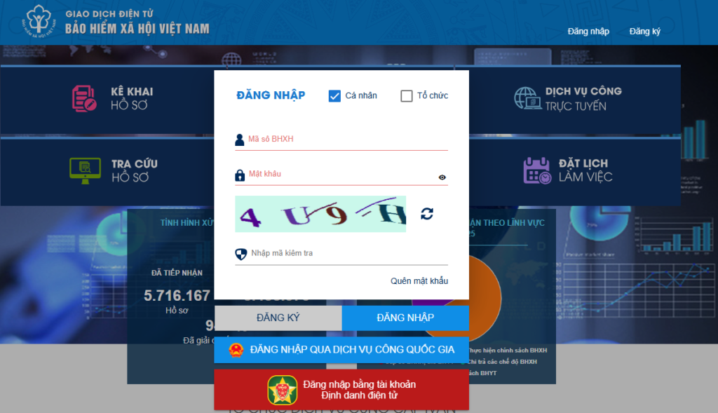Bước 1, truy cập vào Cổng dịch vụ công BHXH (dichvucong.baohiemxahoi.gov.vn), nhấn vào mục đăng nhập; nhập thông tin tài khoản VssID và mã xác nhận để đăng nhập để tiến hành thay đổi từ chứng minh nhân dân sang căn cước công dân trên BHXH (VssID).